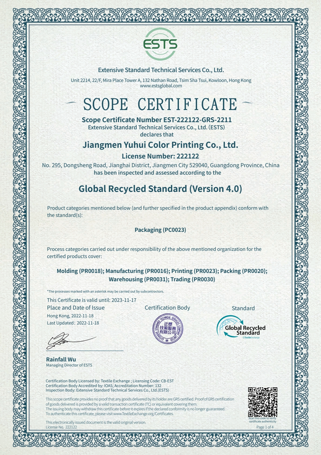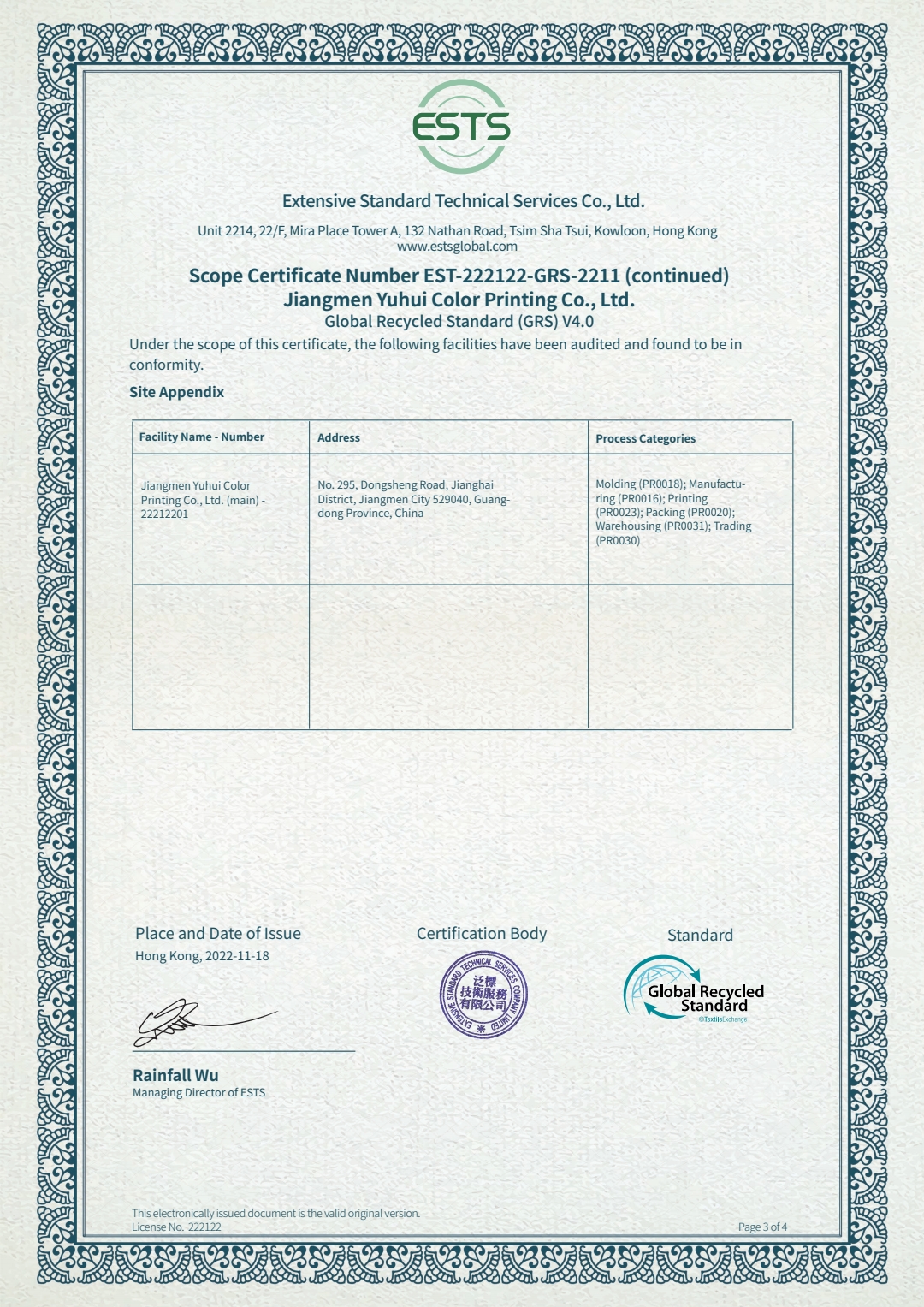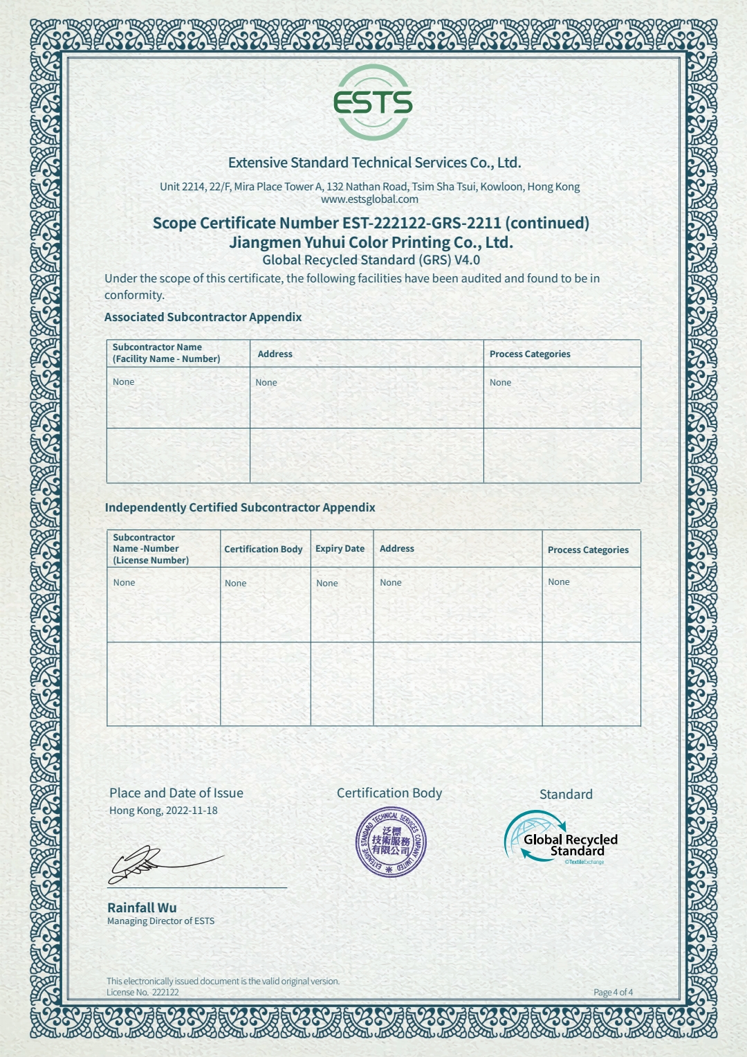 全球回收標(biāo)準(zhǔn)(GRS)是一項國際、自愿 和全面的產(chǎn)品標(biāo)準(zhǔn),規(guī)定了回收內(nèi)容、產(chǎn)銷監(jiān)管鏈、社會責(zé)任和環(huán)境實踐以及化學(xué)品限制的第三方認(rèn)證要求。GRS的目標(biāo)是增加了產(chǎn)品中回收材料的使用,并減少/消除其生產(chǎn)所造成的危害。GRS認(rèn)證的企業(yè)如何被第三方機構(gòu)進(jìn)行監(jiān)管,企業(yè)申請GRS認(rèn)證后,第三方機構(gòu)會對企業(yè)的社會責(zé)任、化學(xué)品管理、環(huán)境管理、GRS認(rèn)證體系這四大內(nèi)容進(jìn)行審核。并且后期每一筆交易也需要向第三方機構(gòu)申請TC交易證書。TC交易證書企業(yè)訂單的追述證明,所需要上游供應(yīng)商:提供上游TC正本原件、采購合同、發(fā)票蓋章聯(lián)彩色拍照、送貨單、包括外發(fā)加工(如有)、銷售資料(內(nèi)銷)及外銷等。