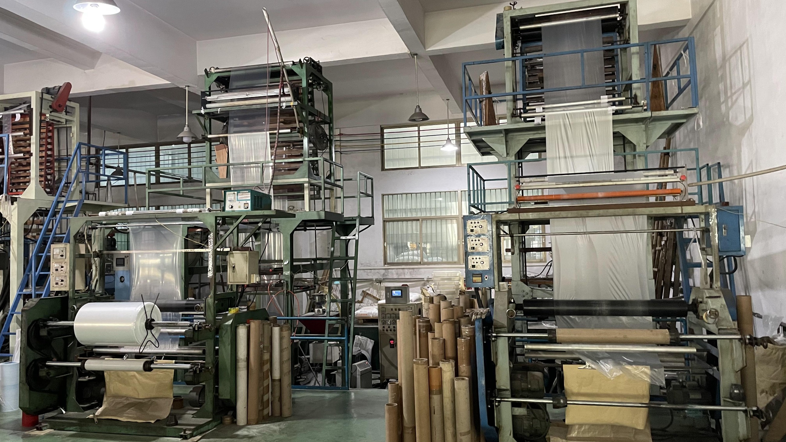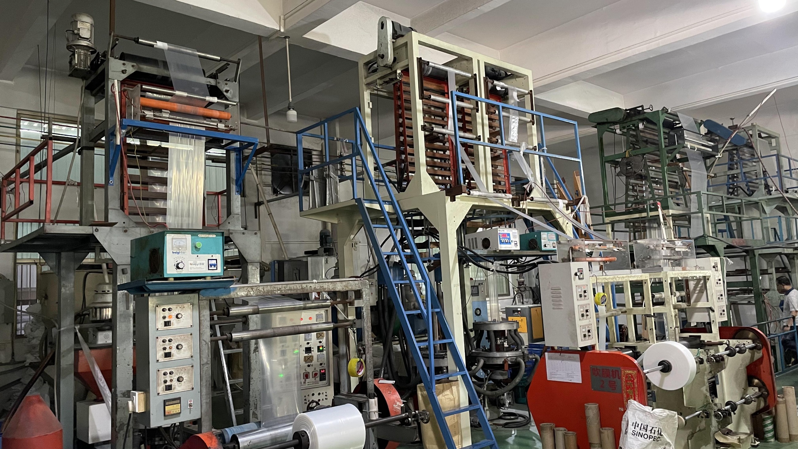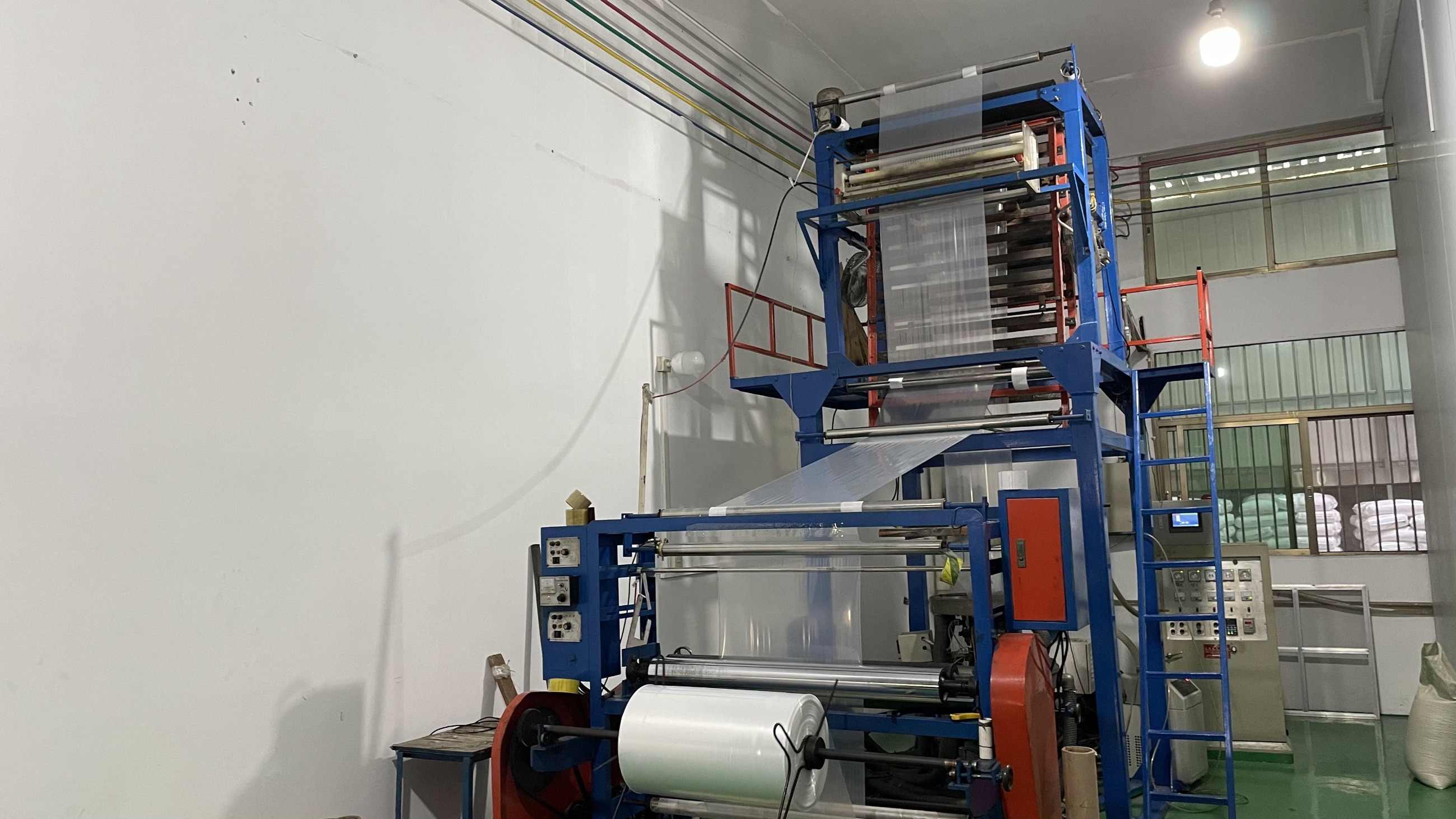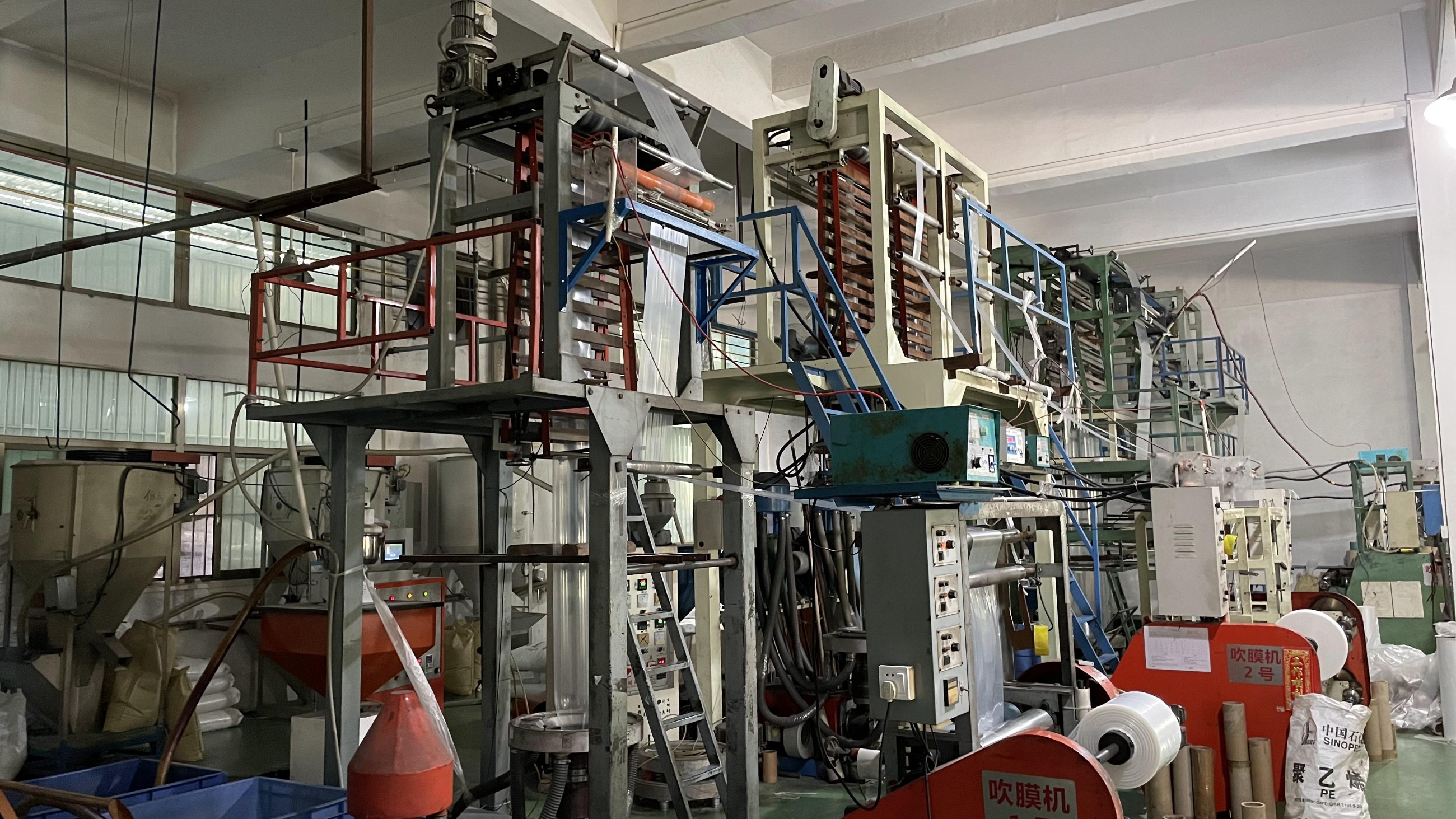 吹膜機結(jié)構(gòu)原理是將塑料粒子加熱融化再吹成塑料薄膜的機械設(shè)備。將干燥的聚乙烯粒子加入下料斗中,靠粒子本身的重量從料斗進入螺桿,當(dāng)粒料與螺紋斜棱接觸后,旋轉(zhuǎn)的斜棱面對塑料產(chǎn)生與斜棱面相垂直的推力。